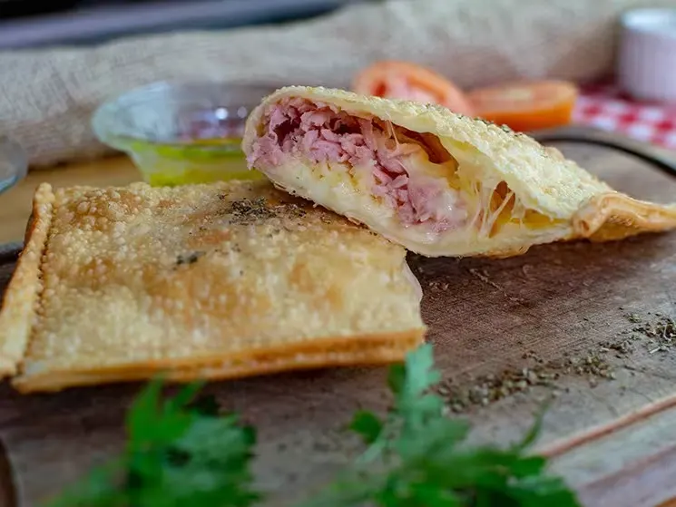 PASTEL PARDALCARNE DE SOL, BACON, CALABRESA, FRANGO, PRESUNTO, QUEIJO, MILHO, ERVILHA, AZEITONA, TOMATE,R$ 26,00