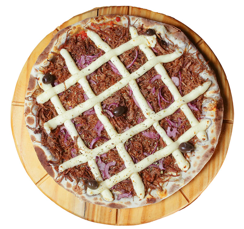PIZZA DE CARNE DE SOL ESPECIALMOLHO, MUSSARELA, CARNE DE SOL, CALABRESA, BACON, TOMATE, AZEITONA E ORÉGANO(P) R$ 38,00 / (M) R$ 46,00 / (G) R$ 53,00